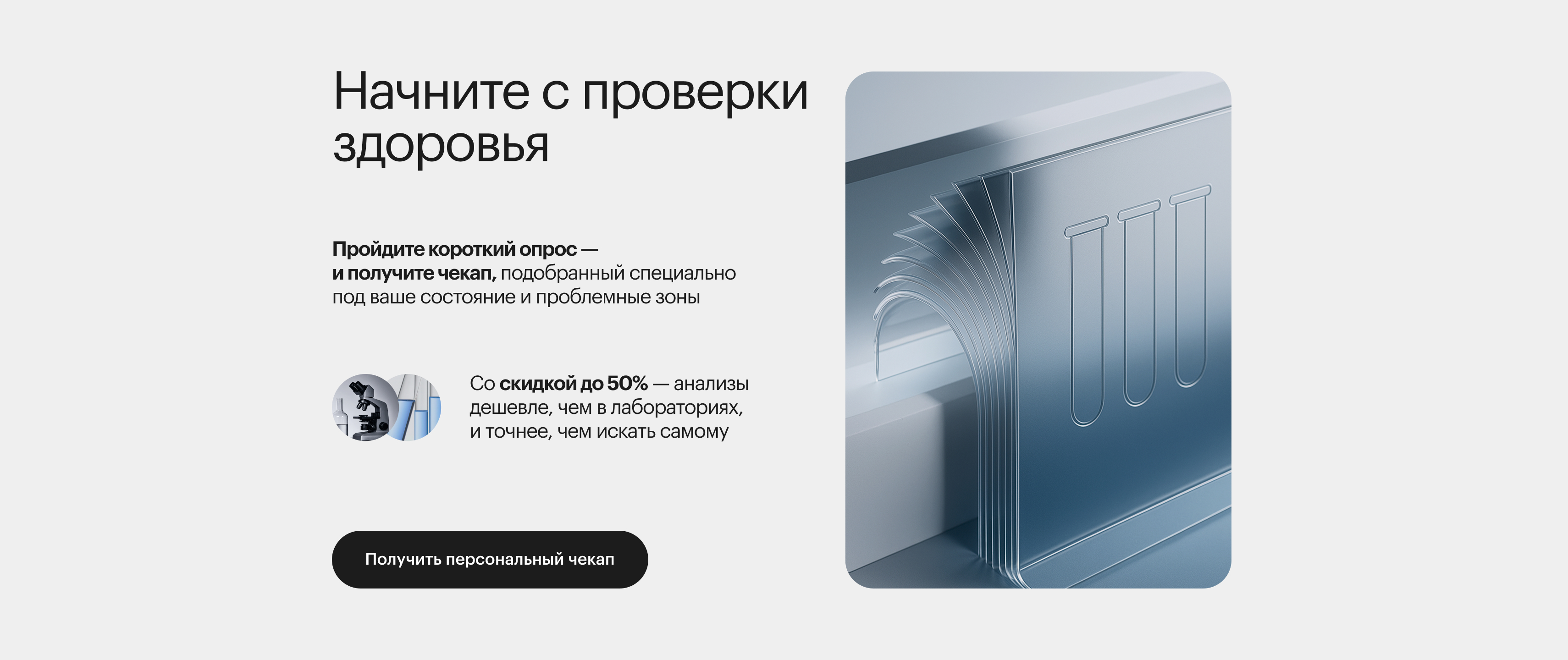 Персонально. Мы бесплатно подбираем курс витаминов и уходовую косметику – специально для вас и ваших целей. Проверенно. Наши продукты разрабатывает команда врачей, опираясь на годы медицинской практики, международные исследования и принципы доказательной медицины. Прозрачно. Качество наших продуктов подтверждено международными и российскими сертификациями, а также отзывами 10 000+ клиентов на сторонних площадках.